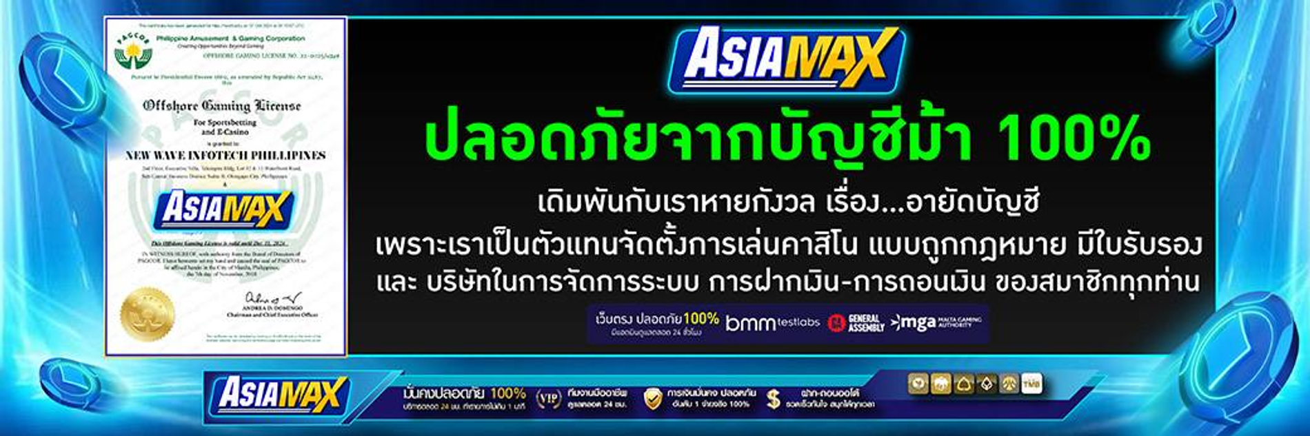 ASIAMAX นับเป็นเว็บพนันออนไลน์ที่ได้รับการยอมรับในระดับสากล ด้วยมาตรฐานการให้บริการที่เป็นเลิศและความน่าเชื่อถือที่สั่งสมมาอย่างยาวนาน เว็บไซต์แห่งนี้ได้รับใบอนุญาตการดำเนินธุรกิจอย่างถูกต้องตามกฎหมายจากหน่วยงานที่เกี่ยวข้อง ซึ่งเป็นสิ่งที่การันตีความปลอดภัยให้กับผู้เล่นทุกคน